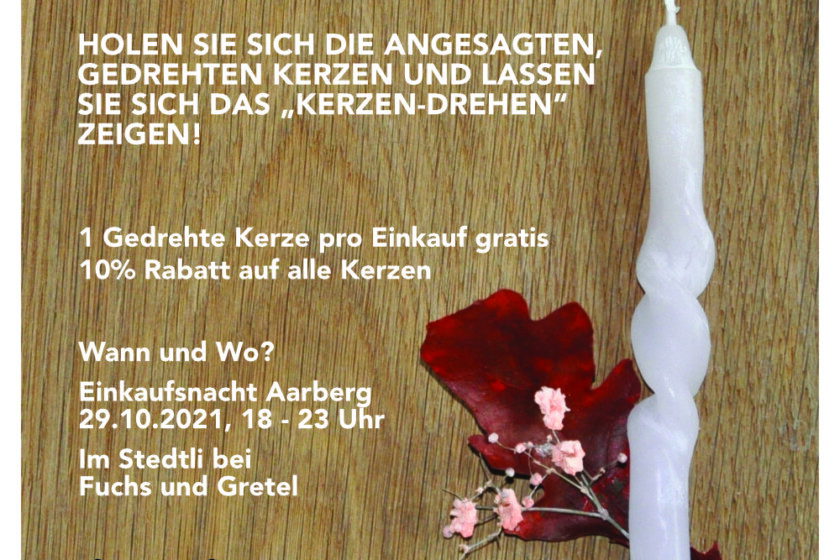 An der Einkaufsnacht in Aarberg am 29. Oktober 2021 drehen wir für Sie Kerzen. Auf unser Kerzensortiment gewähren wir an diesem Abend 10 % Rabatt.