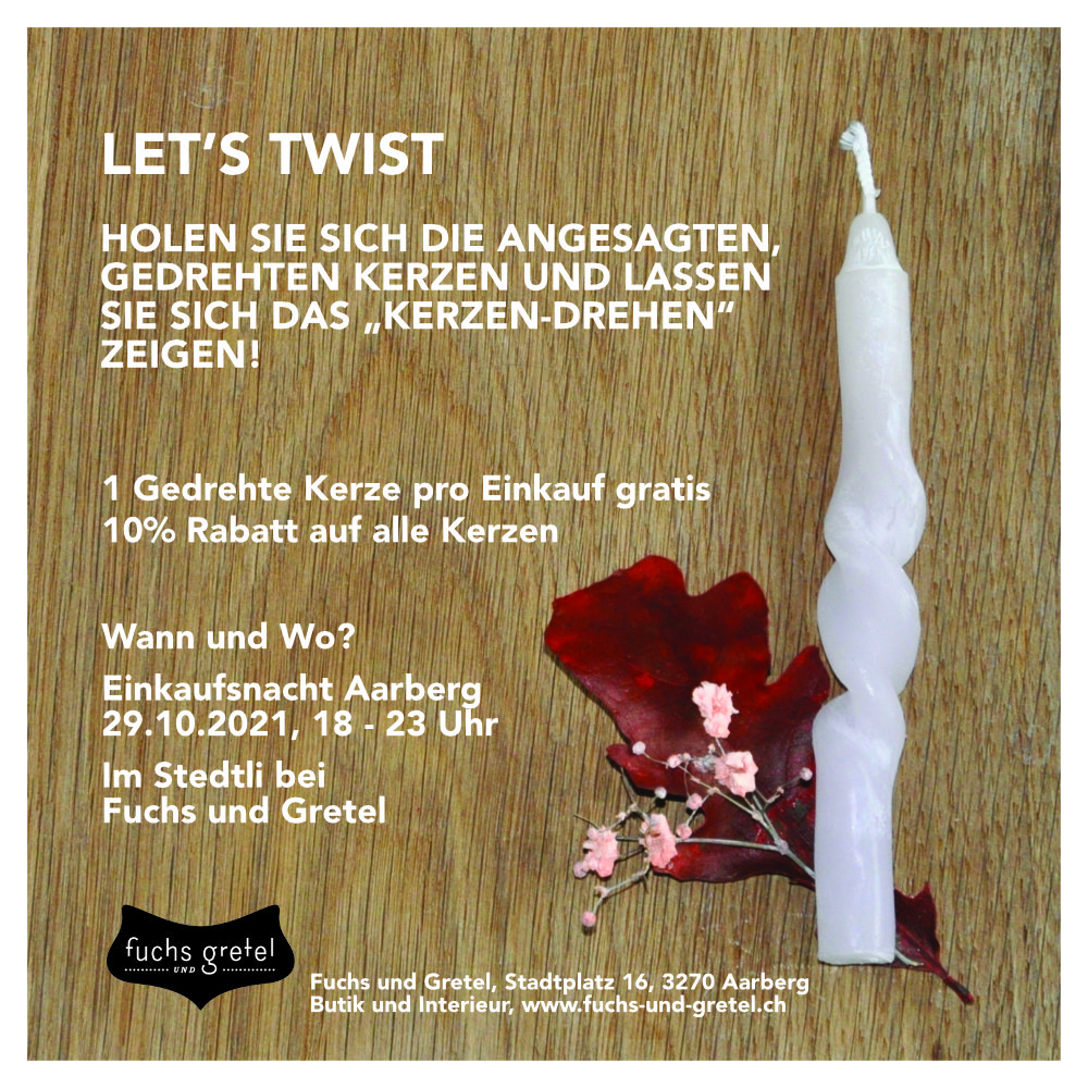 An der Einkaufsnacht in Aarberg am 29. Oktober 2021 drehen wir für Sie Kerzen. Auf unser Kerzensortiment gewähren wir an diesem Abend 10 % Rabatt.