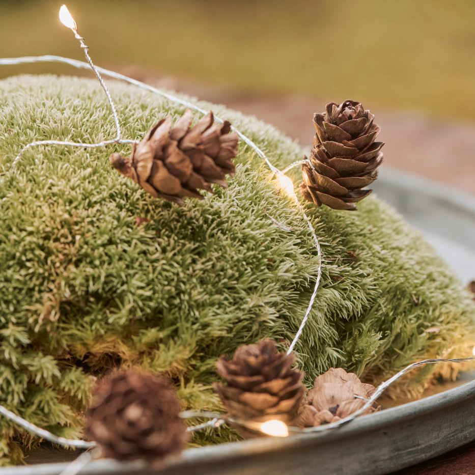 Die filigrane Lichterkette von Ib Laursen, geschmückt mit kleinen Tannenzapfen, verbreitet ein zartes, warmes Licht in die weihnächtliche Zeit. Die Lichterkette mit 10 Lichtern und 10 Tannenzapfen an einem 120 cm langen silberfarbenen Draht lässt sich vielseitig einsetzen. Und dank dem Batteriebetrieb auch unabhängig vom Zugang zu einer Steckdose. Lassen Sie Ihrer Fantasie freien Lauf. Schmücken Sie Dekorationen aus Zweigen oder Pflanzen und Fenster usw. mit dieser feinen Kette. Auch aufgewickelt in ein Glasgefäss gelegt, zaubert der Charme der Kette Gemütlichkeit in Räume oder auf festlich gedeckte Tische.