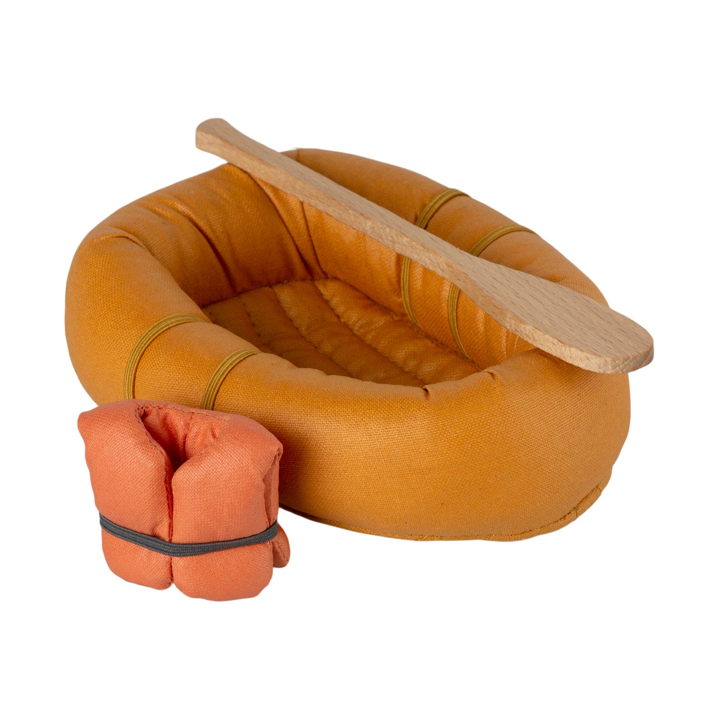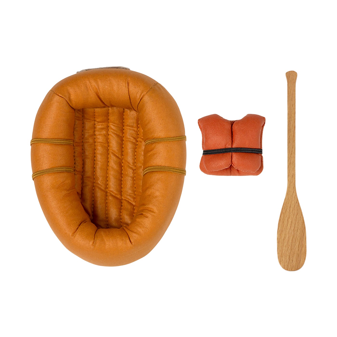 Das kleine Gummiboot und die Schwimmweste von Maileg begleitet die Hiker Mouse auf ihren Abenteuern. Mit dabei ist auch ein Holzpaddel. Das Boot und die Schwimmweste bestehen aus Stoff und passen perfekt für Big brother und sister. Das Boot ist nicht wassertauglich, mit Phantasie lassen sich deshalb Abenteuer in Wildbächen, auf Seen oder im Meer nachspielen.
