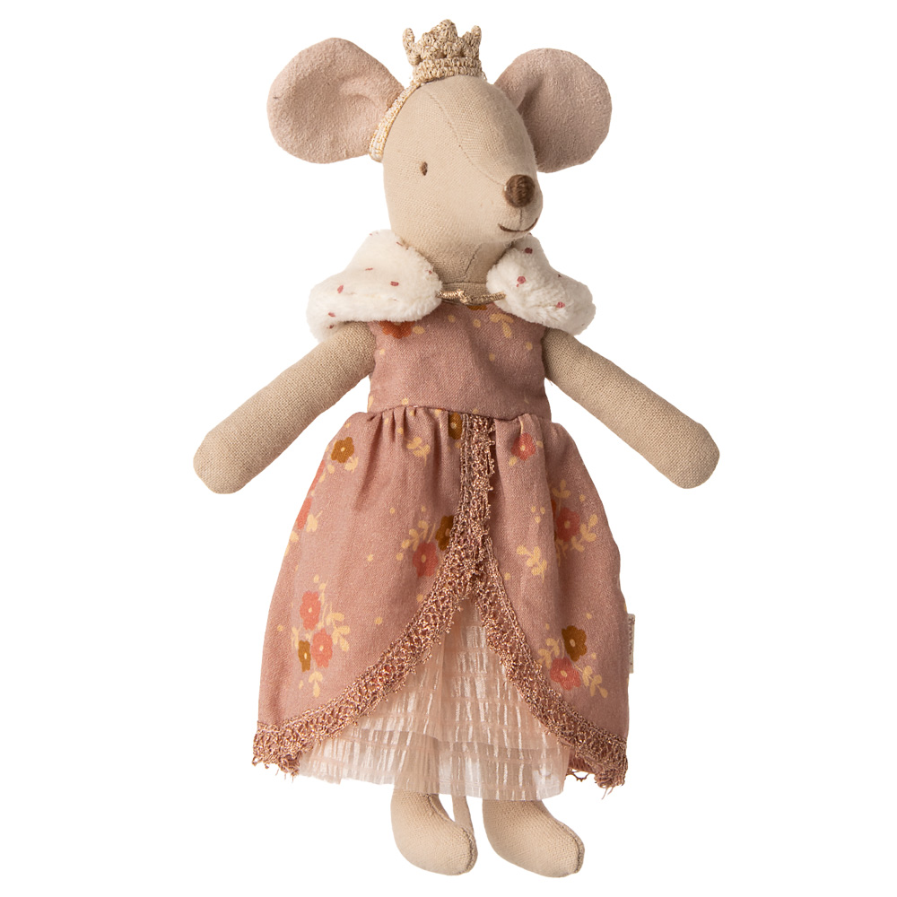 Königin sein – ein Traum geht in Erfüllung! In diesem Maileg Königinnenkleid und der edlen Krone erstrahlt die Mama Maus in stolzem Glanz.